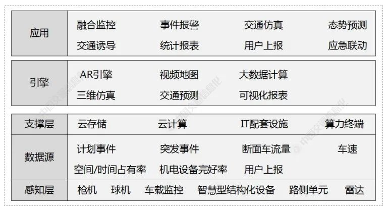 基于上述算法,提出了高速公路區(qū)間交通態(tài)勢(shì)預(yù)測(cè)系統(tǒng)架構(gòu),分為感知層、數(shù)據(jù)源層、支撐層、引擎層和應(yīng)用層。每個(gè)層次根據(jù)不同的功能又分為不同的應(yīng)用模塊。系統(tǒng)架構(gòu)如下圖所示。各層分別執(zhí)行以下功能。