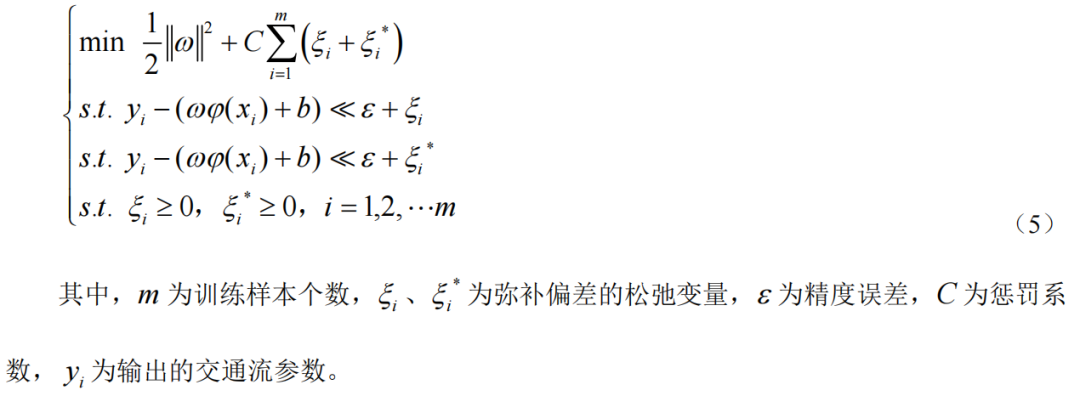 其中,xi為輸入的交通流參數(shù),ω為權(quán)重向量,為非線性核函數(shù),b為偏差項(xiàng),f(x)為交通流的預(yù)測(cè)值。轉(zhuǎn)換SVR模型為: