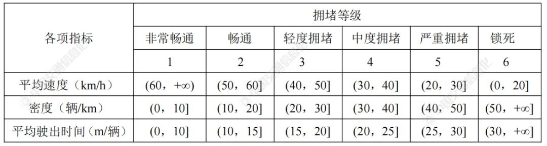 美國(guó)交通研究委員會(huì)發(fā)行的《道路通信能力手冊(cè)》[15]中將交通擁堵?tīng)顟B(tài)分為六個(gè)等級(jí):1非常暢通、2暢通、3輕度擁堵、4中度擁堵、5嚴(yán)重?fù)矶隆?鎖死,數(shù)值越高表明交通擁堵情況越嚴(yán)重。結(jié)合本文具有的道路數(shù)據(jù)資源,確定3個(gè)因素指標(biāo)對(duì)應(yīng)交通擁堵?tīng)顟B(tài)的取值范圍,如表2所示。